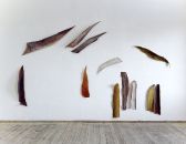 Durch das Verkleben von kleinen Papier-und Stoffstücken (cirka 5x5 cm) entsteht in einem langwierigen Prozess die Form der Erdflügel. Die Quadrate werden währenddessen in die Form integriert. Gesiebte Erde, selbst sammelt, gebunden mit Acryldispersion gibt den Objekten die Farbe.